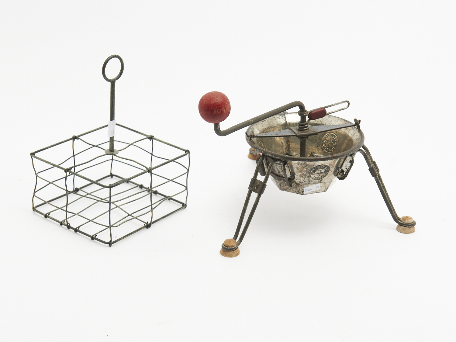 A FRENCH 1950'S MOULINETTE FOOD MILL AND A WIRE BOTTLE BASKET H.21CM, LEONARD JOEL LOCAL DELIVERY: SMALL