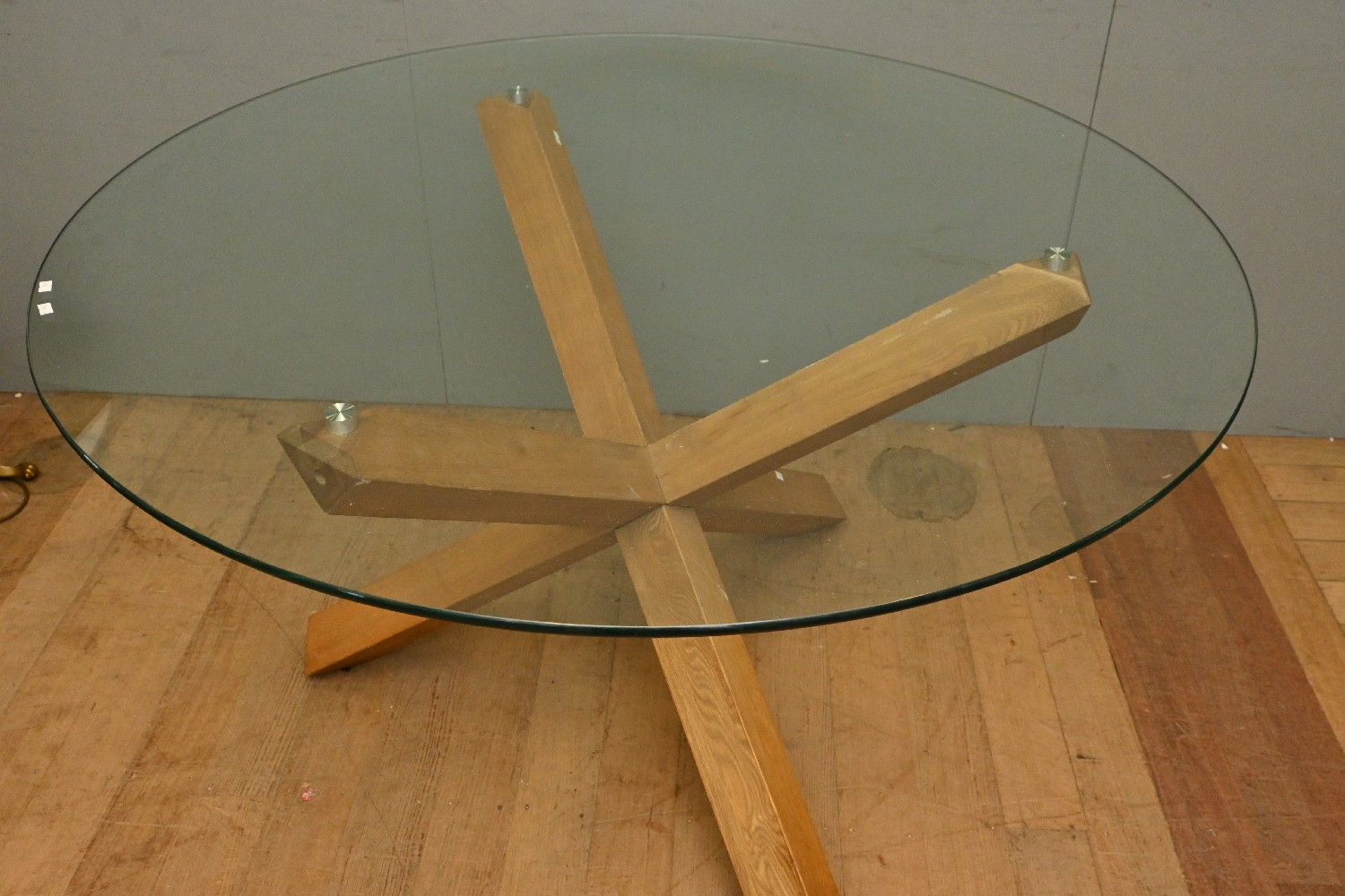 A CONTEMPORARY TIMBER AND GLASS TOP DINING TABLE (A/F) (74H X 130DIA CM) (PLEASE NOTE THIS HEAVY ITEM MUST BE REMOVED BY CARRIERS AT THE CUSTOMER'S EXPENSE. LEONARD JOEL STAFF CANNOT ASSIST CARRYING THIS ITEM) (X-LARGE ITEM)