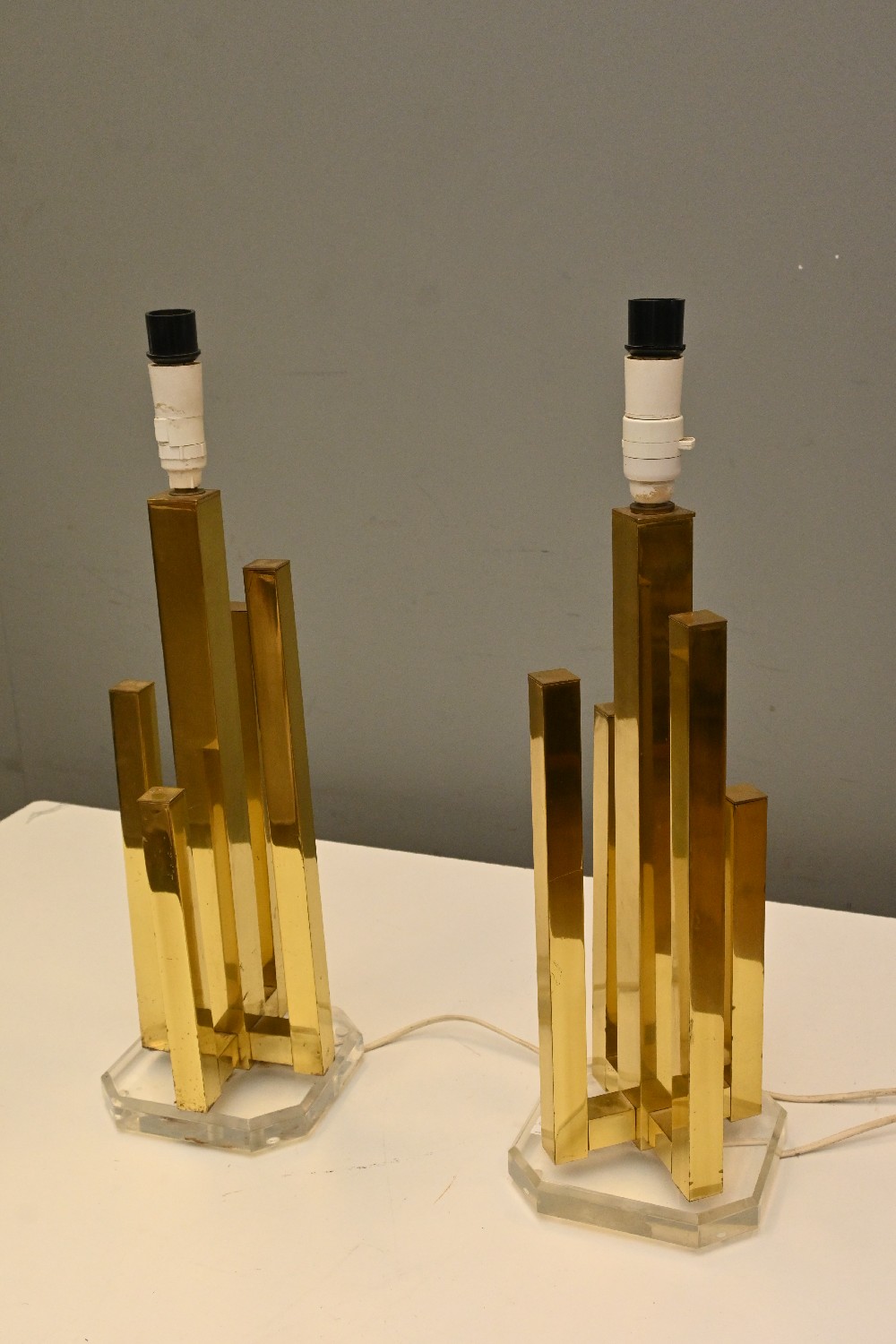 A PAIR OF BRASS AND PERSPEX TABLE LAMPS - NO SHADES (A/F) (61H CM) (LEONARD JOEL DELIVERY SIZE: LARGE)