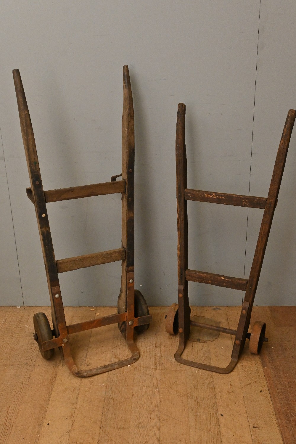TWO VINTAGE TROLLEYS (A/F) (124H X 50W X 34D CM) (PLEASE NOTE THIS HEAVY ITEM MUST BE REMOVED BY CARRIERS AT THE CUSTOMER'S EXPENSE. LEONARD JOEL STAFF CANNOT ASSIST CARRYING THIS ITEM) (X-LARGE ITEM)