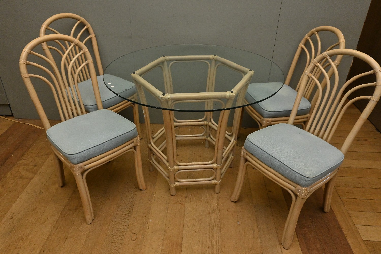 A CANE & WICKER FIVE PIECE DINING SETTING (75H X 108D CM) (PLEASE NOTE THIS HEAVY ITEM MUST BE REMOVED BY CARRIERS AT THE CUSTOMER'S EXPENSE. LEONARD JOEL STAFF CANNOT ASSIST CARRYING THIS ITEM) (X-LARGE ITEM)