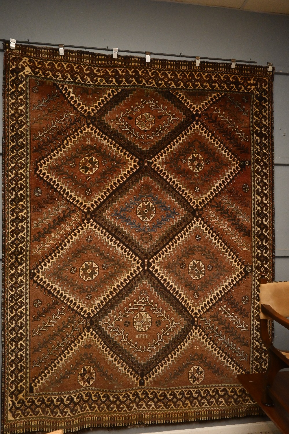 A PERSIAN SHIRAZ RUG. 100% WOOL AND WEFT PILE, NATURAL DYES. HAND-KNOTTED VILLAGE WEAVE WITH AN ALL-OVER DIAMOND DESIGN MOTIFS CONTAINING TREE OF LIFE AND TRIBAL MOTIFS ON EARTH TONES OF BEIGE, CHOCOLATE AND DEEP GREEN. SIZE: 300 X 226 CM. ORIGIN: PERSIA - RRP: $2,300. DOCUMENTATION OF AUTHENTICITY INCLUDED