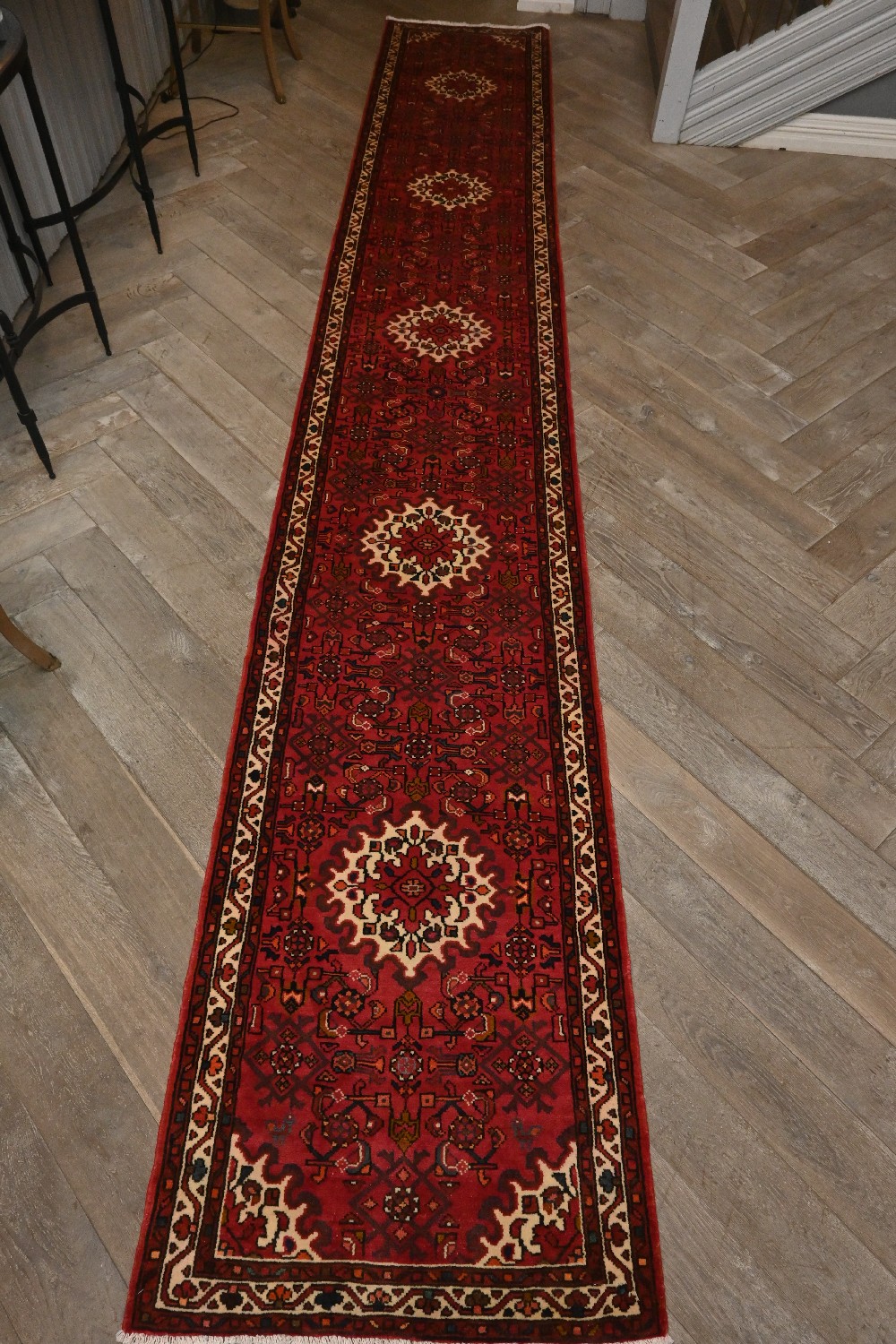 A NEW EXTRA LONG PERSIAN HOSSAINABAD HALL RUNNER. 100% WOOL PILE. SOLID & HARD-WEARING, GREAT FOR HIGH TRAFFIC AREAS. VILLAGE WEAVE FROM THE HAMADAN REGION WITH A DESIGN OF CONTINUING MEDALLIONS ON AN ALL-OVER FLORAL HERATI MAHI PATTERNS IN A SOFT RED FIELD. BORDER OF GEOMETRIC AND FLORAL MOTIFS. SIZE: 505 X 82 CM