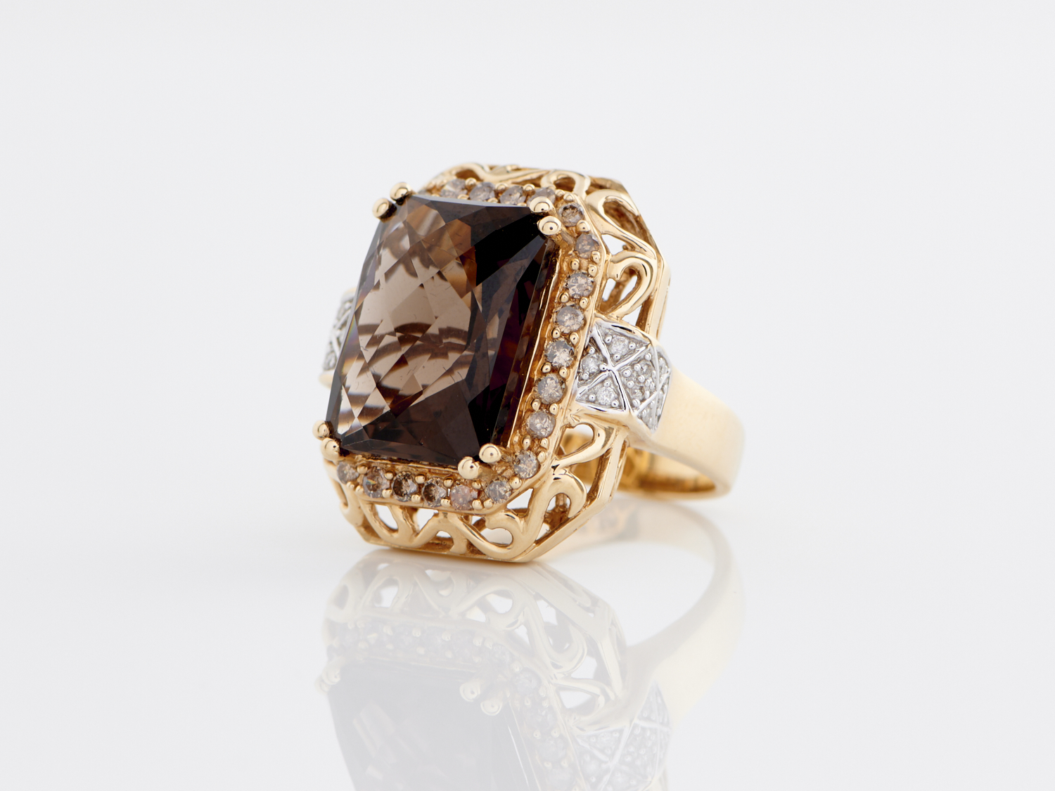 A SMOKY QUARTZ AND DIAMOND RING IN 14CT GOLD, RING SIZE N 1/2, 11.2GMS