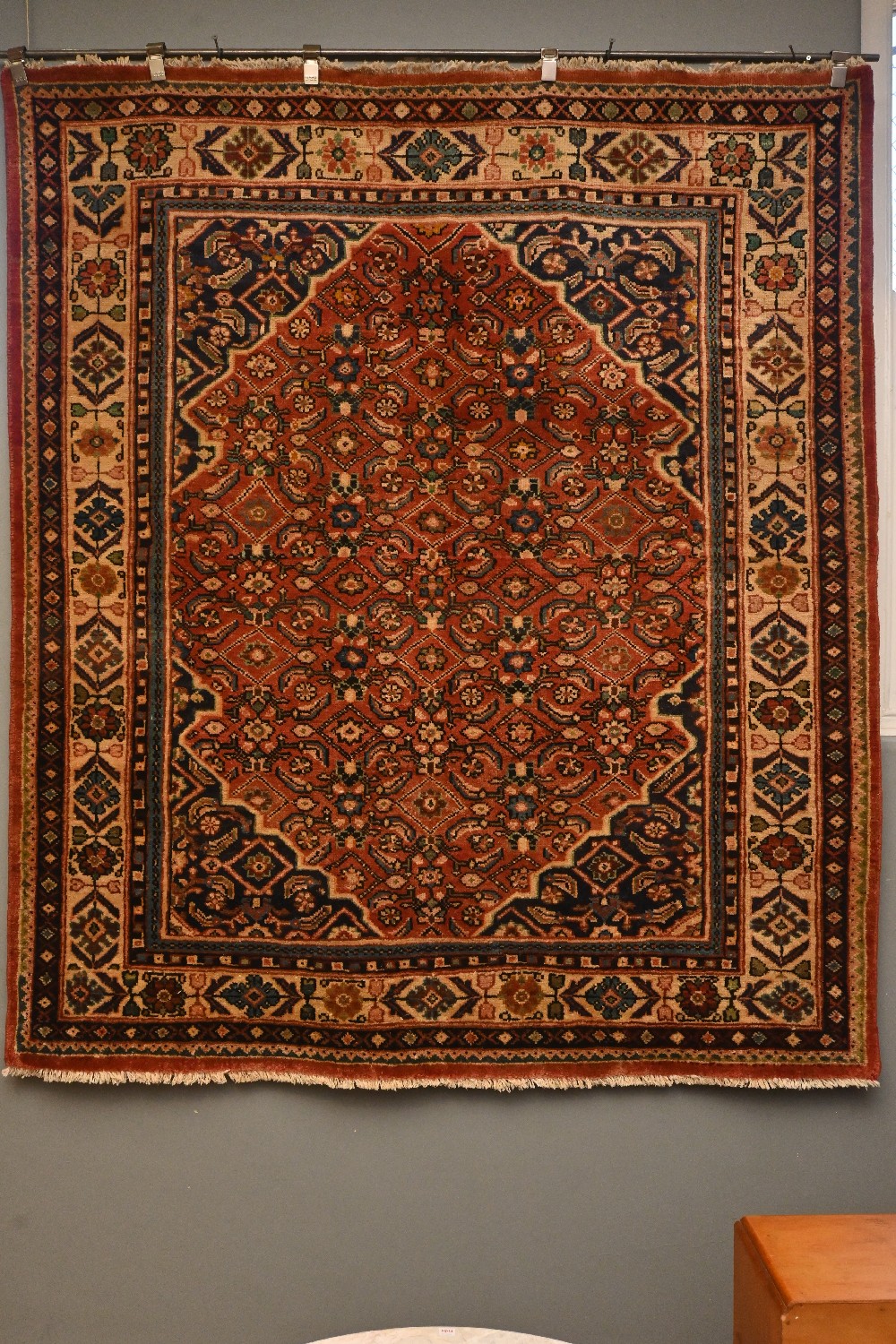 A PERSIAN MAHALOT RUG. 100% HAND SPUN WOOL, NATURAL DYES. HAND-KNOTTED VILLAGE WEAVE FROM THE MALAYER COUNTY. TRIBAL DESIGN OF ALL-OVER LARGE HERATI MAHI PATTERNS SET WITHIN A SOFT RED FIELD AND CORNER MEDALLIONS IN NAVY BLUE. BORDER OF LARGE FLORAL MOTIFS. SIZE: 226 X 196 CM. ORIGIN: IRAN- RRP: $1,500. DOCUMENTATION OF AUTHENTICITY INCLUDED