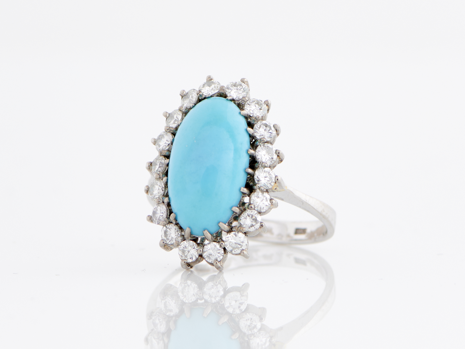 A TURQUOISE AND DIAMOND SET CLUSTER RING IN 18CT WHITE GOLD, RING SIZE P, 6.2GMS