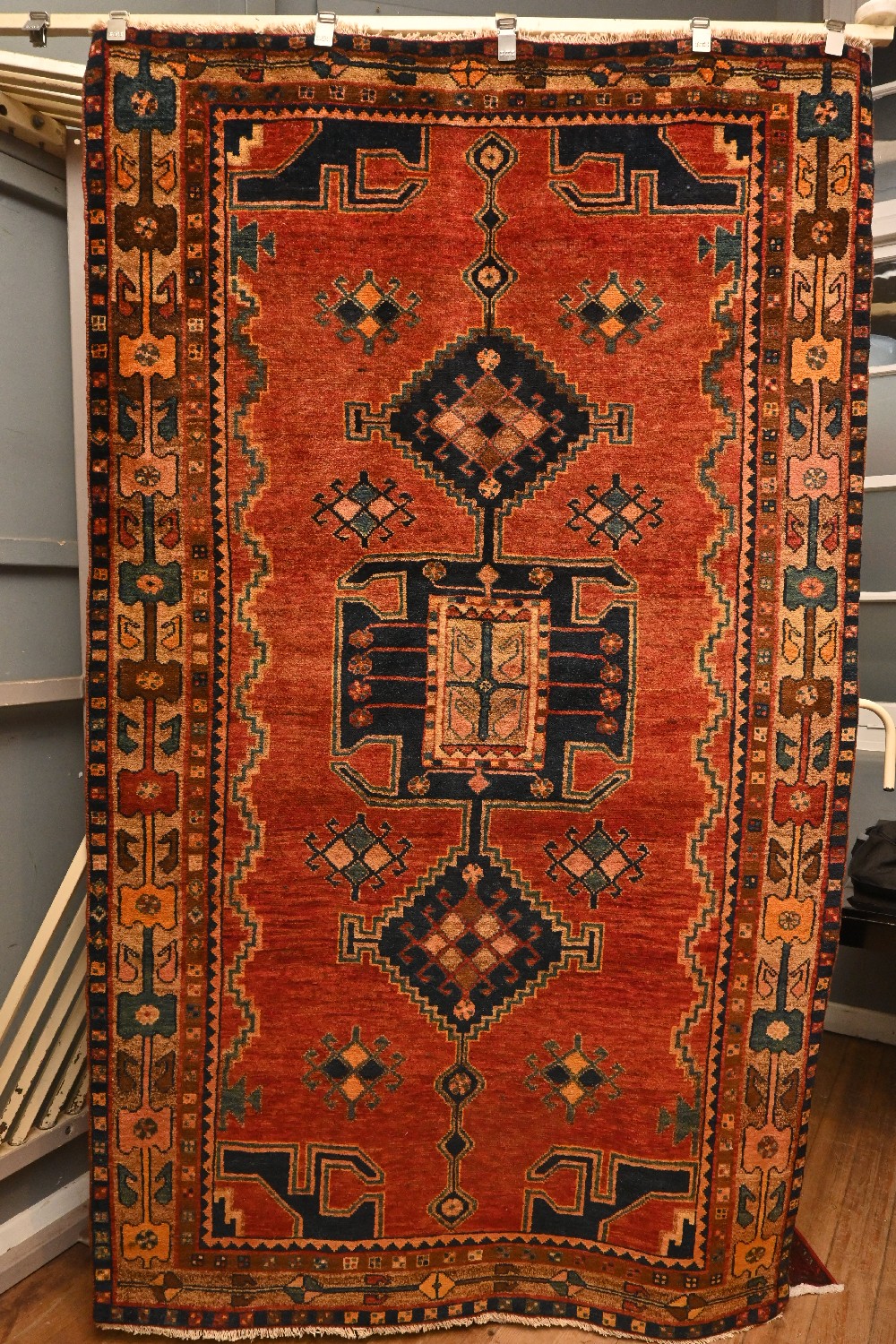 A TRIBAL PERSIAN KOOHI RUG, 100% WOOL, VINTAGE PILE, NATURAL DYES. HAND-KNOTTED TRIBAL WEAVE WITH DESIGN OF TRIPLE POLE ANCHORED MEDALLIONS WITH THE CENTRAL MEDALLION CONTAINING PAISLEY AND CROSS MOTIFS FROM A CHRISTIAN ARMENIAN WEAVER, ON A POMEGRANATE RED FIELD OF TRIBAL DIAMOND MOTIFS. BORDER OF COLOURFUL GEOMETRIC PATTERNS. SIZE: 245 X 147 CM. ORIGIN: PERSIA - RRP: $1,600. DOCUMENTATION OF AUTHENTICITY INCLUDED