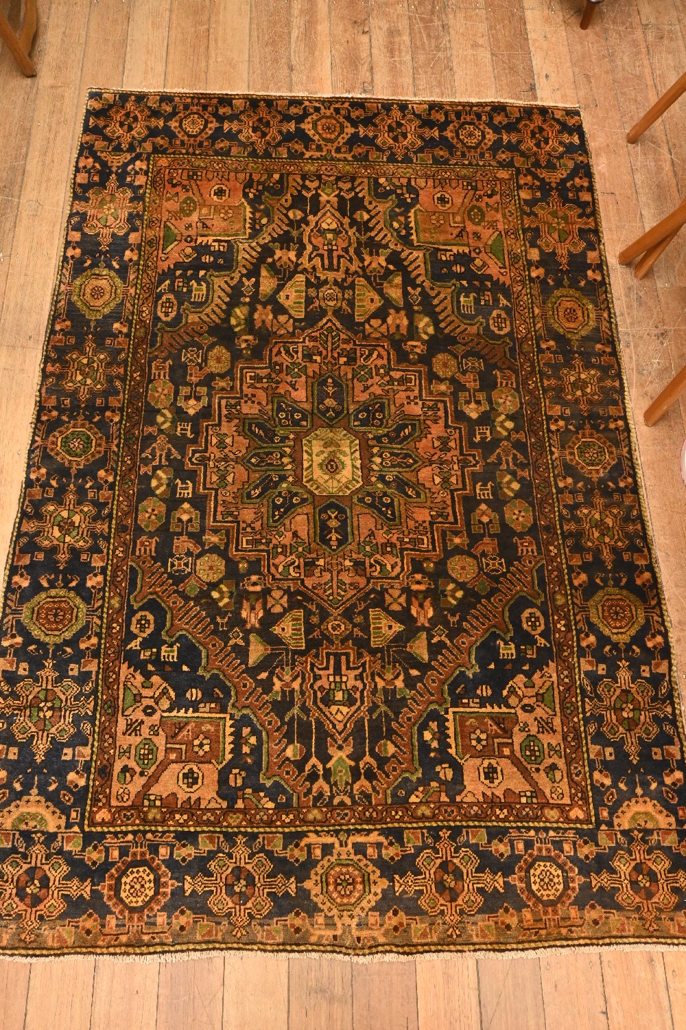 A PERSIAN TIRBAL BIDJAR GHOLTOGH RUG, 100% WOOL, DENSE AND SOLID. HAND-KNOTTED TRIBAL WEAVE FROM THE KURDISTAN REGION AND TRIBAL DESIGN OF BOLD ANCHORED HEXAGONAL MEDALLION ON A NAVY BLUE FIELD OF BIRDS, BUTTERFLIES AND HORSE AND GEOMETRIC MOTIFS. WITH TRIBAL MOTIFS AND ANIMAL FORM. BORDER OF UNIQUE TRIBAL MOTIFS. ALL OVER TONES OF NAVY BLUE, COGNAC, WITH GOLD AND SAGE GREEN HIGHLIGHTS. SIZE: 196 X 130 CM. ORIGIN: IRAN - RRP: $2,800. DOCUMENTATION OF AUTHENTICITY INCLUDED