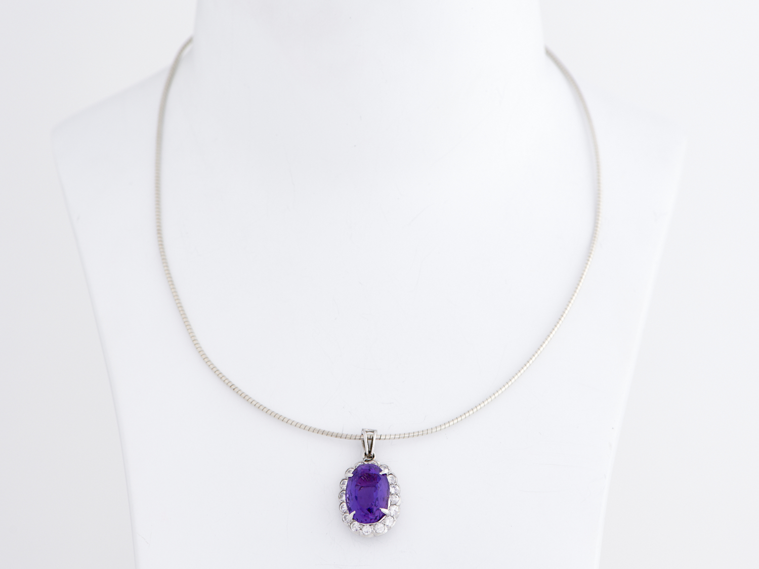 AN AMETHYST AND CUBIC ZIRCONIA SET PENDANT IN 9CT WHITE GOLD, THE AMETHYST OF 8.60CTS, LENGTH 22MM, SUSPENDED ON AN OMEGA COLLAR IN SILVER