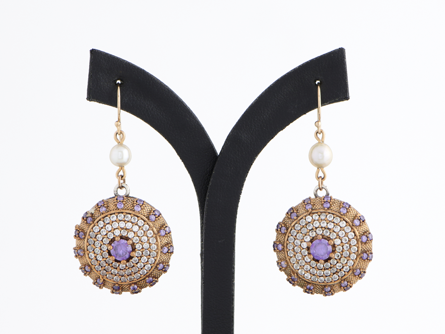 A PAIR OF GEM SET EARRINGS IN SILVER GILT WITH CULTURED PEARL DETAIL, TO SHEPHERDS HOOK FITTINGS