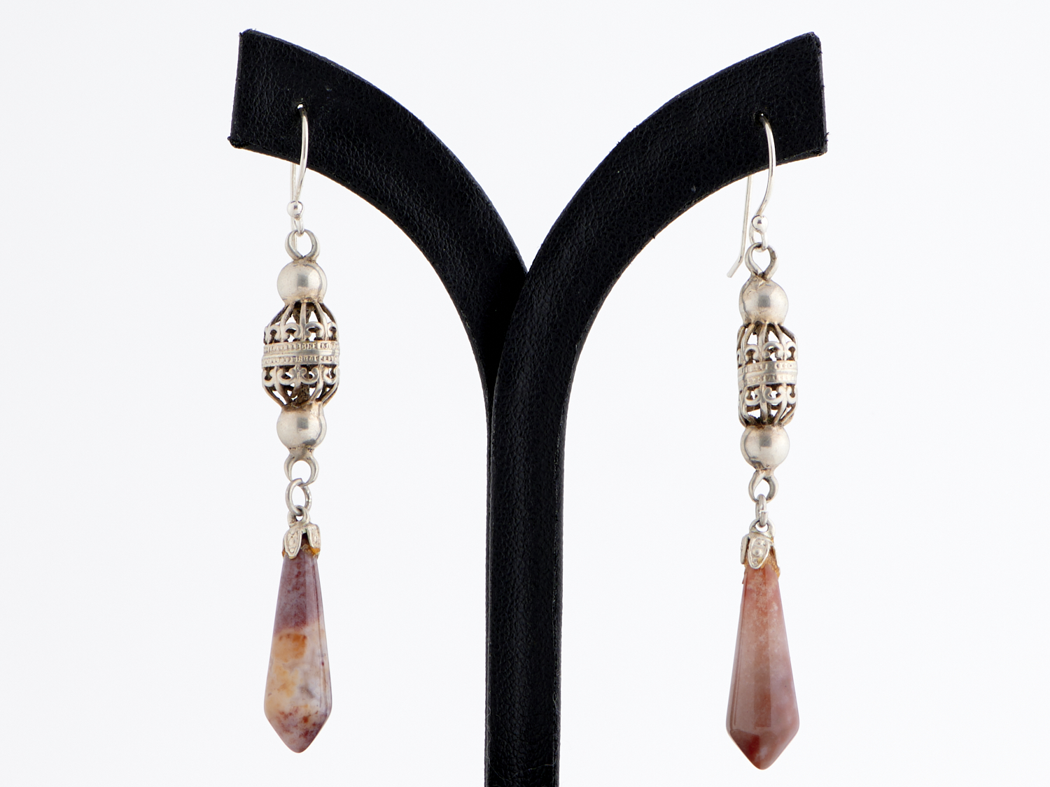 A PAIR OF VINTAGE AGATE SET PENDANT EARRINGS IN SILVER, TO SHEPHERDS HOOK FITTINGS