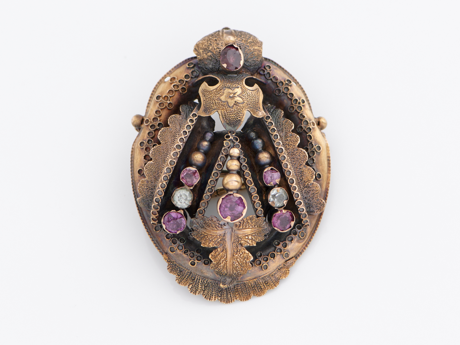 AN ANTIQUE GEM SET BROOCH IN 15CT GOLD, 45 X 25 MM, 5.2GMS
