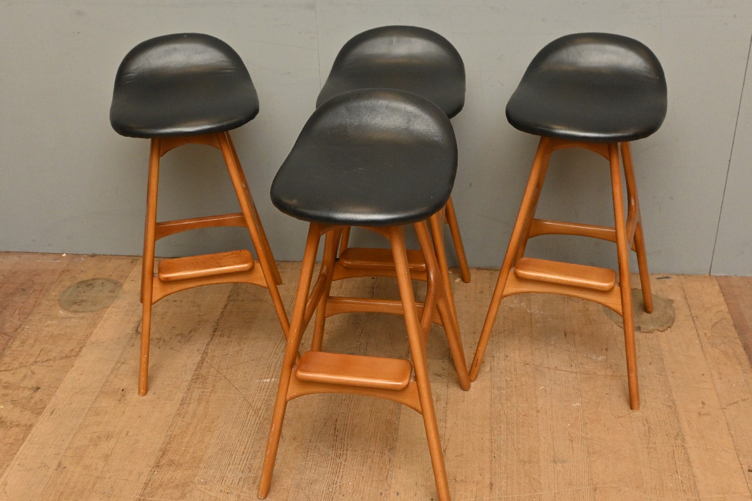 A SET OF FOUR RETRO TEAK AND LEATHER STOOLS (A/F) (75H X 35W X 45D CM) (LEONARD JOEL DELIVERY SIZE: X-LARGE)
