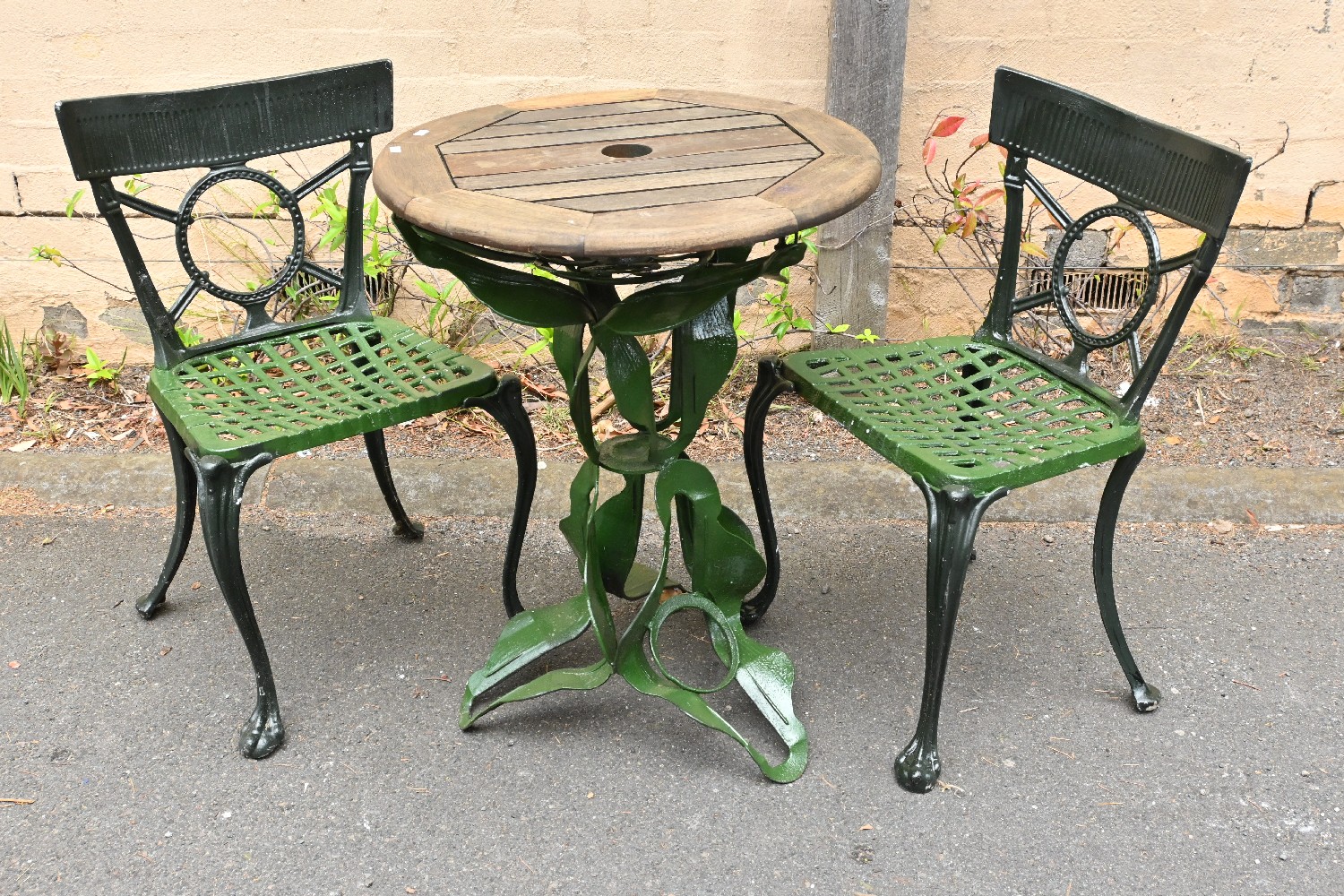 A VICTORIAN STYLE CAST METAL THREE PIECE OUTDOOR SETTING (78H X 60D CM) (PLEASE NOTE THIS HEAVY ITEM MUST BE REMOVED BY CARRIERS AT THE CUSTOMER'S EXPENSE. LEONARD JOEL STAFF CANNOT ASSIST CARRYING THIS ITEM) (X-LARGE ITEM)