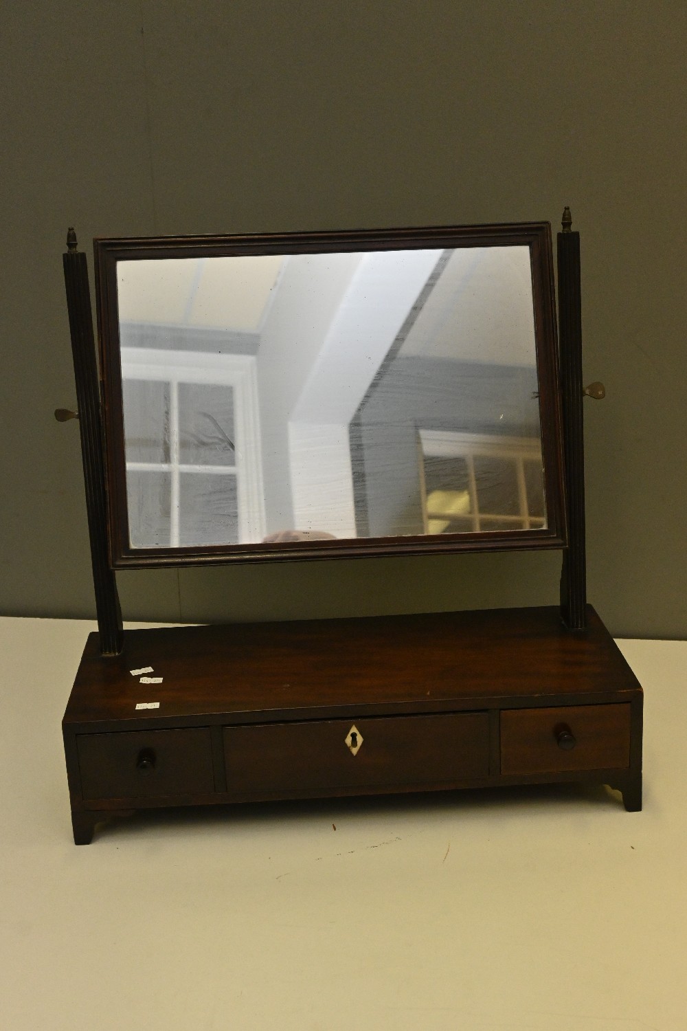 AN EARLY 20TH CENTURY MAHOGANY TOILET MIRROR WITH THREE DRAWERS TO LOWER SECTION (A/F) (56H X 54W X 22D CM) (LEONARD JOEL DELIVERY SIZE: LARGE)