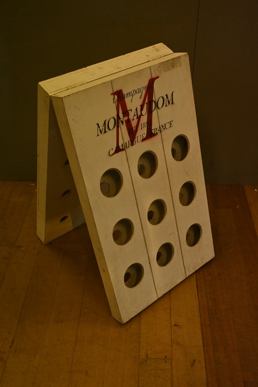 A VINTAGE WOODEN FRENCH MONTAUDOM CHAMPAGNE RACK (A/F) (78H X 48W X 56D CM) (LEONARD JOEL DELIVERY SIZE: LARGE)