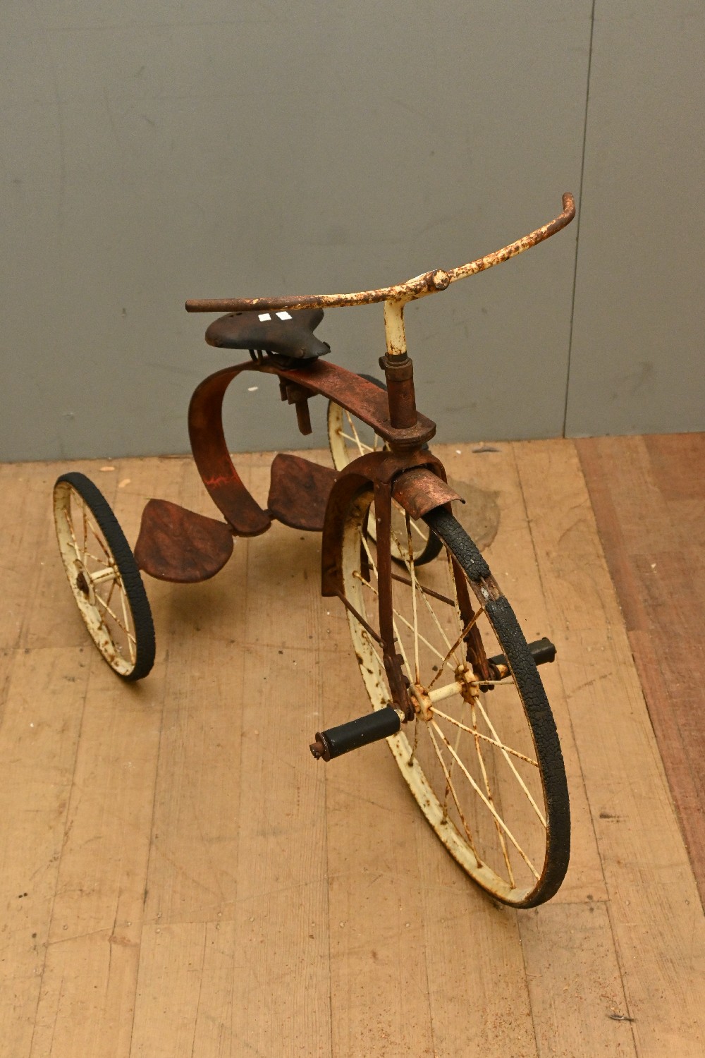 A VINTAGE 1920S AUSTRALIAN MADE METAL TRICYCLE WITH ORIGINAL LEATHER SEAT (A/F) (77H X 46W X 85D CM) (LEONARD JOEL DELIVERY SIZE: LARGE)