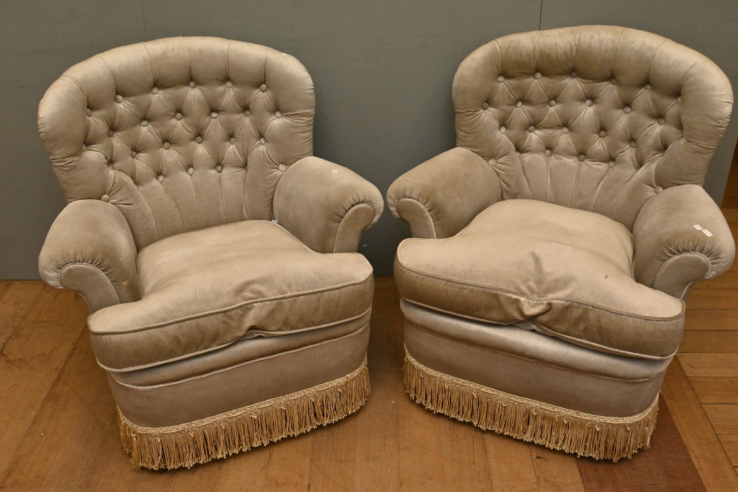 A PAIR OF BUTTON BACK UPHOLSTERED LOUNGE CHAIRS ON CASTORS (A/F) (85H X 80W X 64D CM) (PLEASE NOTE THIS HEAVY ITEM MUST BE REMOVED BY CARRIERS AT THE CUSTOMER'S EXPENSE. LEONARD JOEL STAFF CANNOT ASSIST CARRYING THIS ITEM) (X-LARGE ITEM)
