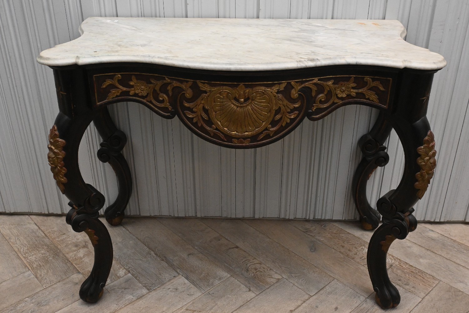 A 19TH CENTURY EBONISED CARVED FLORAL AND GILT DETAILED MARBLE TOPPED SIDE TABLE (A/F) (97H X 120W X 62D CM) (PLEASE NOTE THIS HEAVY ITEM MUST BE REMOVED BY CARRIERS AT THE CUSTOMER'S EXPENSE. LEONARD JOEL STAFF CANNOT ASSIST CARRYING THIS ITEM) (X-LARGE ITEM)