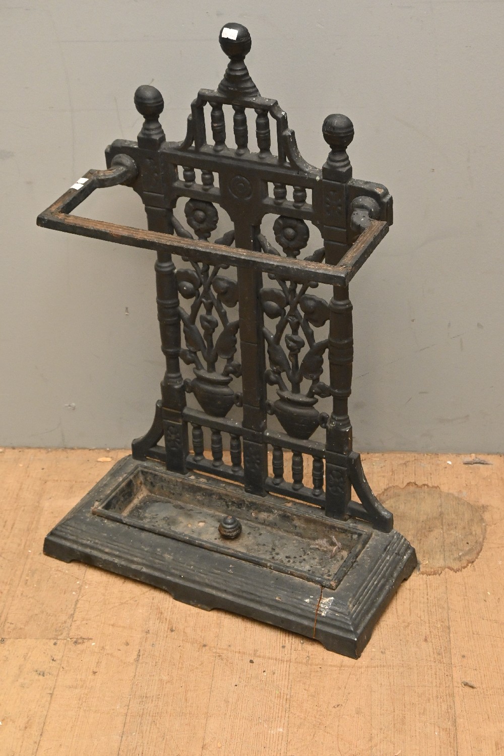 A VICTORIAN BLACK CAST-IRON FLORAL DECORATED UMBRELLA STAND (A/F) (80H X 55W X 22D CM) (PLEASE NOTE THIS HEAVY ITEM MUST BE REMOVED BY CARRIERS AT THE CUSTOMER'S EXPENSE. LEONARD JOEL STAFF CANNOT ASSIST CARRYING THIS ITEM) (X-LARGE ITEM)