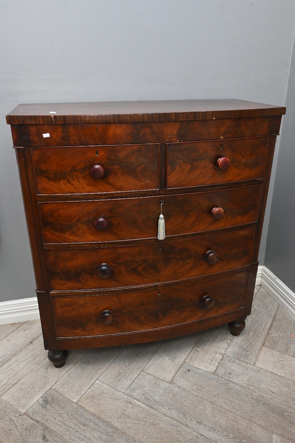 AN EARLY VICTORIAN MAHOGANY BOW-FRONT CHEST OF DRAWERS (A/F) (117H X 106W X 51D CM) (PLEASE NOTE THIS HEAVY ITEM MUST BE REMOVED BY CARRIERS AT THE CUSTOMER'S EXPENSE. LEONARD JOEL STAFF CANNOT ASSIST CARRYING THIS ITEM) (X-LARGE ITEM)