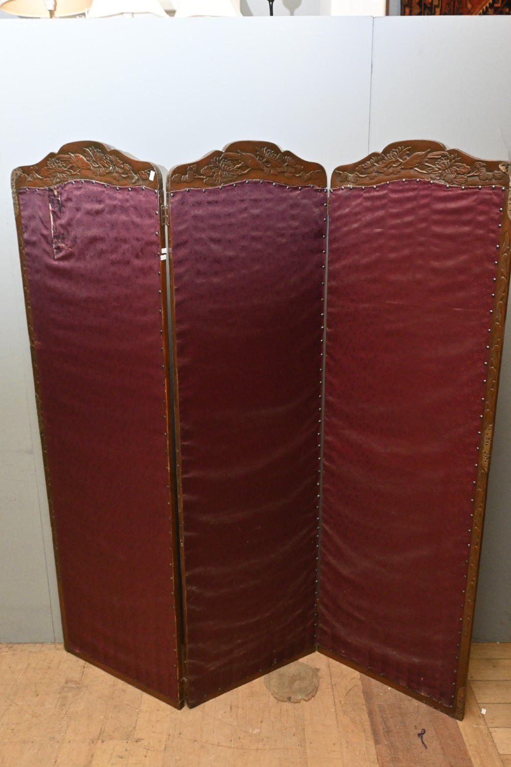 AN EARLY 20TH CENTURY CHINESE WOODEN FRAMED SILK PRIVACY SCREEN WITH BRASS DETAILING (A/F) (177H X 55W PER PANEL) (LEONARD JOEL DELIVERY SIZE: LARGE)