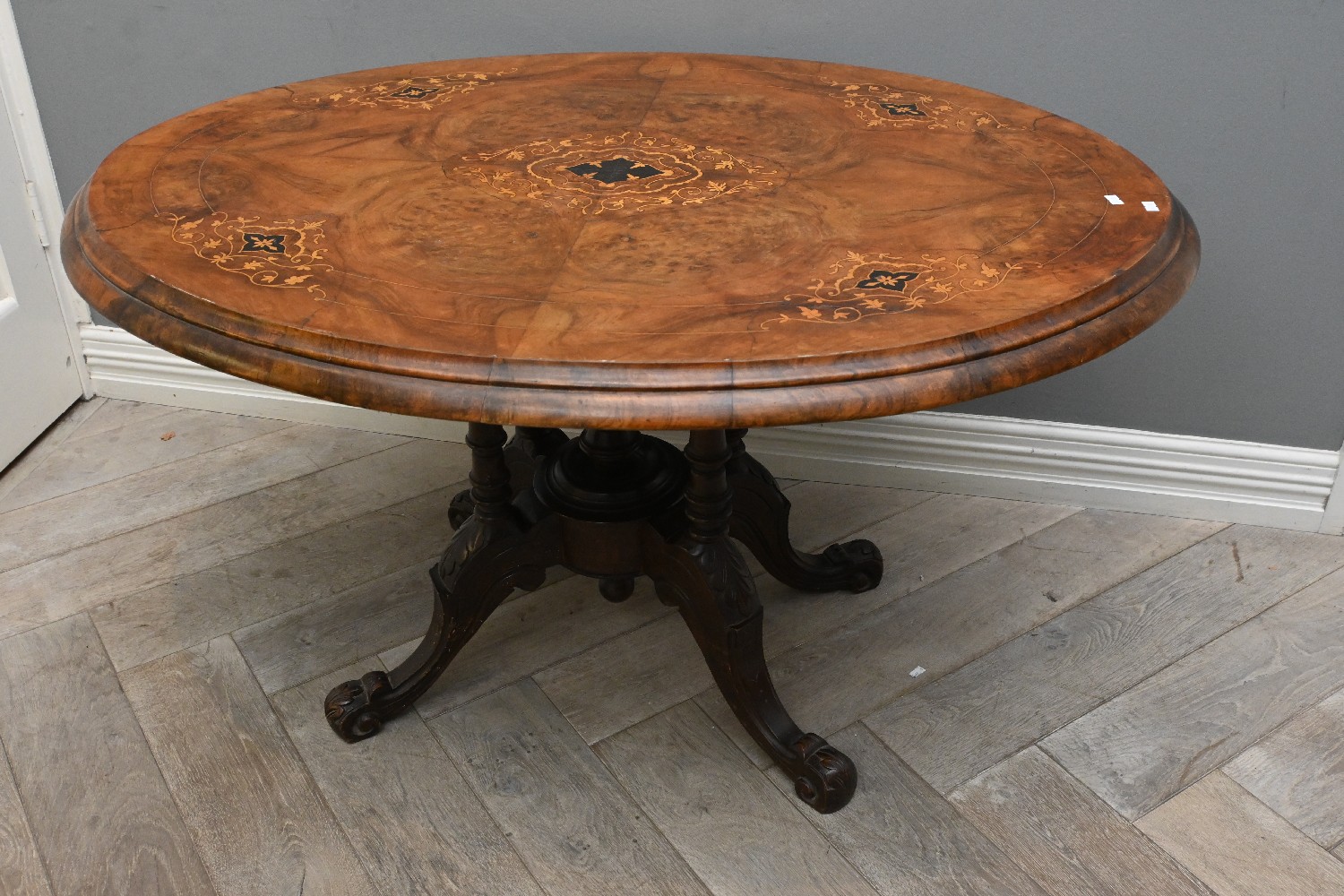 A 19TH CENTURY INLAID WALNUT BIRDCAGE FORM BASE TILT TOP TABLE (A/F) (70H X 120W X 89D CM) (LEONARD JOEL DELIVERY SIZE: X-LARGE)