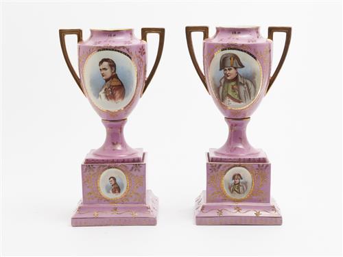A PAIR OF ROYAL VIENNA HANDLED URNS ON STANDS H.43.5CM, LEONARD JOEL LOCAL DELIVERY: SMALL
