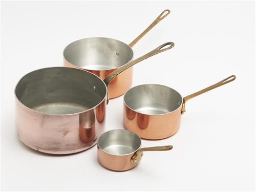 A SET OF FOUR GRADUATED COPPER SAUCEPANS DIA.19CM (LARGEST), LEONARD JOEL LOCAL DELIVERY: SMALL