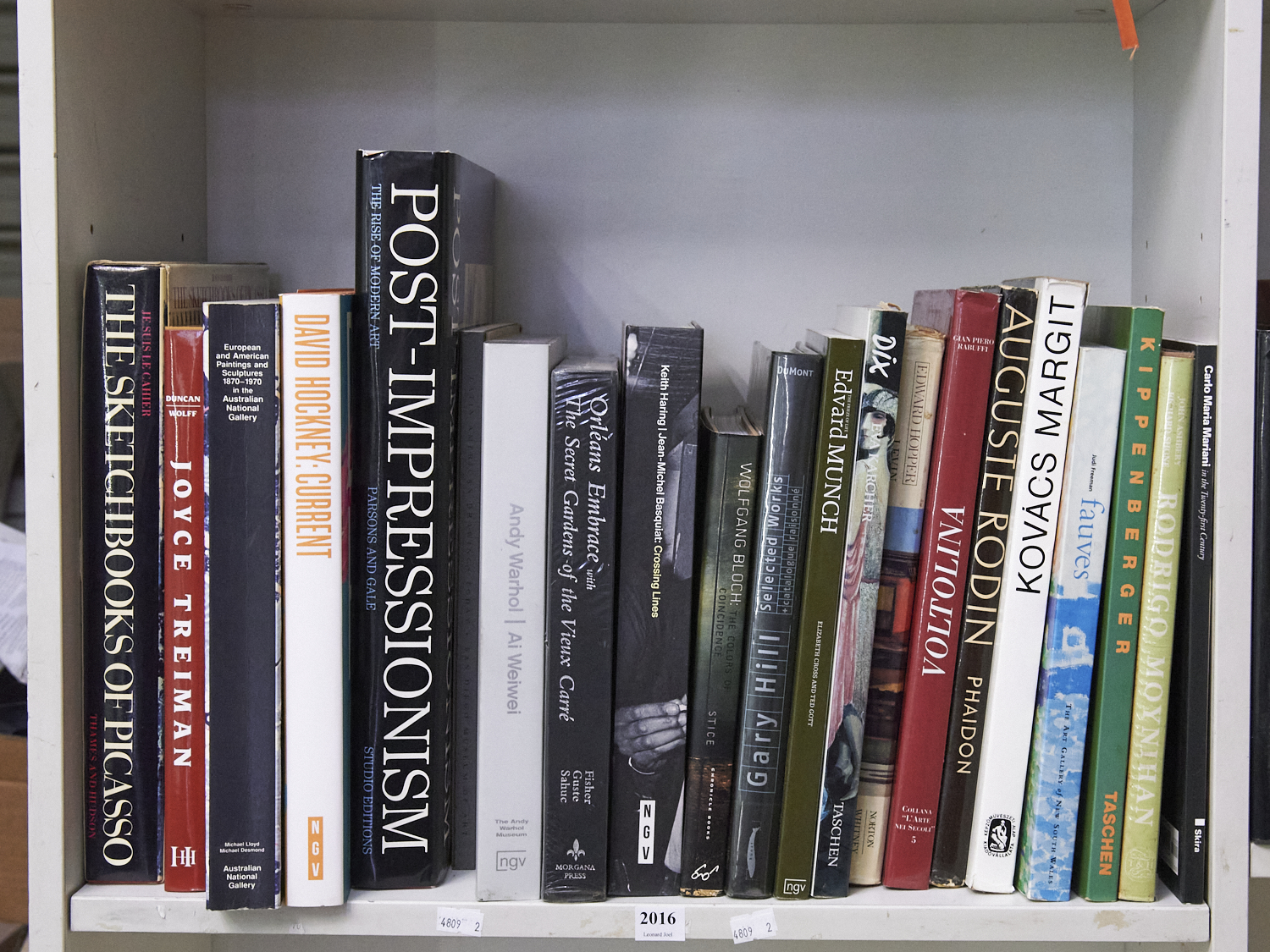 A SHELF OF 20TH C. ART REFERENCE INCLUDING DAVID HOCKNEY "CURRENT", EVA KARCHER "DIX", GARY HILL "SELECTED WORKS AND CATALOGUE RAISONNE, "CROSSING LINES" (KEITH HARING, JEAN-MICHEL BASQUIAT), LEONARD JOEL LOCAL DELIVERY: MEDIUM