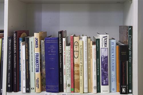 A SHELF OF LOCAL HISTORIES INCLUDING COOPER "THE HISTORY OF ST.KILDA 1840-1930' (VOL 1), C.E. SAYERS "SHEPHERDS GOLD", PLUS HISTORIES OF ESSENDON, LEONARD JOEL LOCAL DELIVERY: MEDIUM