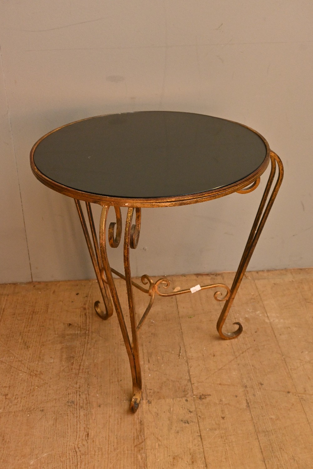 A SMALL METAL TABLE WITH GLASS TOP (48H X 50DIA CM) (LEONARD JOEL DELIVERY SIZE: MEDIUM)