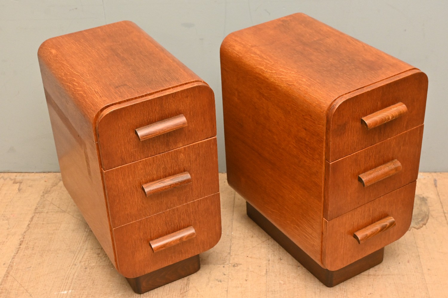 A PAIR OF ART DECO OAK THREE DRAWER BEDSIDE TABLES (A/F) (60H X 29W X 46D CM) (LEONARD JOEL DELIVERY SIZE: LARGE)