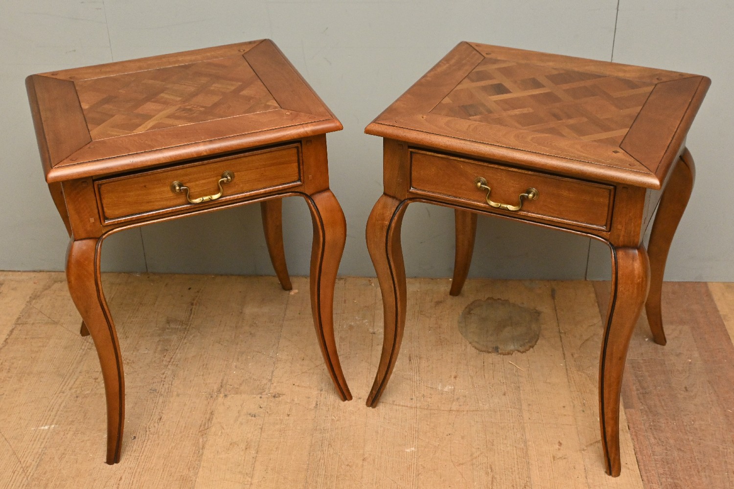 A PAIR OF FRENCH PROVINCIAL STYLE SINGLE DRAWER BEDSIDE TABLES WITH PARQUETRY TOP (65H X 51W X 46D CM) (LEONARD JOEL DELIVERY SIZE: X-LARGE)