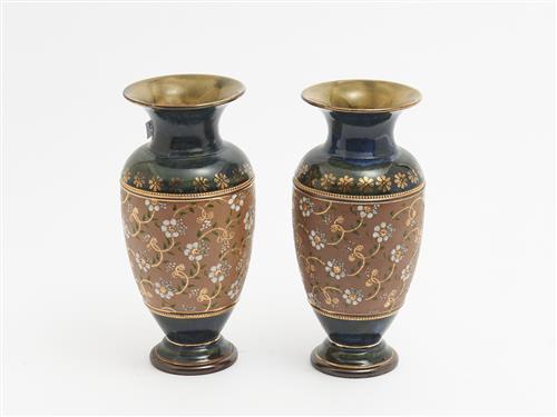 A PAIR OF ROYAL DOULTON STONEWARE VASES H.27.5CM (A/F), LEONARD JOEL LOCAL DELIVERY: SMALL