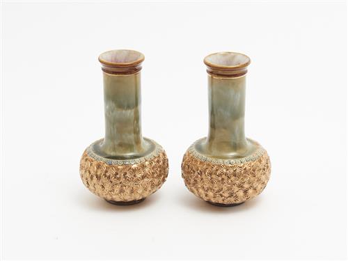 A PAIR OF ROYAL DOULTON STONEWARE VASES WITH GILT DETAILING H.16CM, LEONARD JOEL LOCAL DELIVERY: SMALL