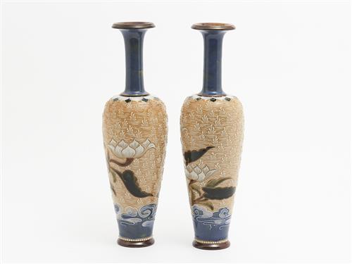 A PAIR OF DOULTON LAMBETH STONEWARE VASES H.39CM, LEONARD JOEL LOCAL DELIVERY: MEDIUM