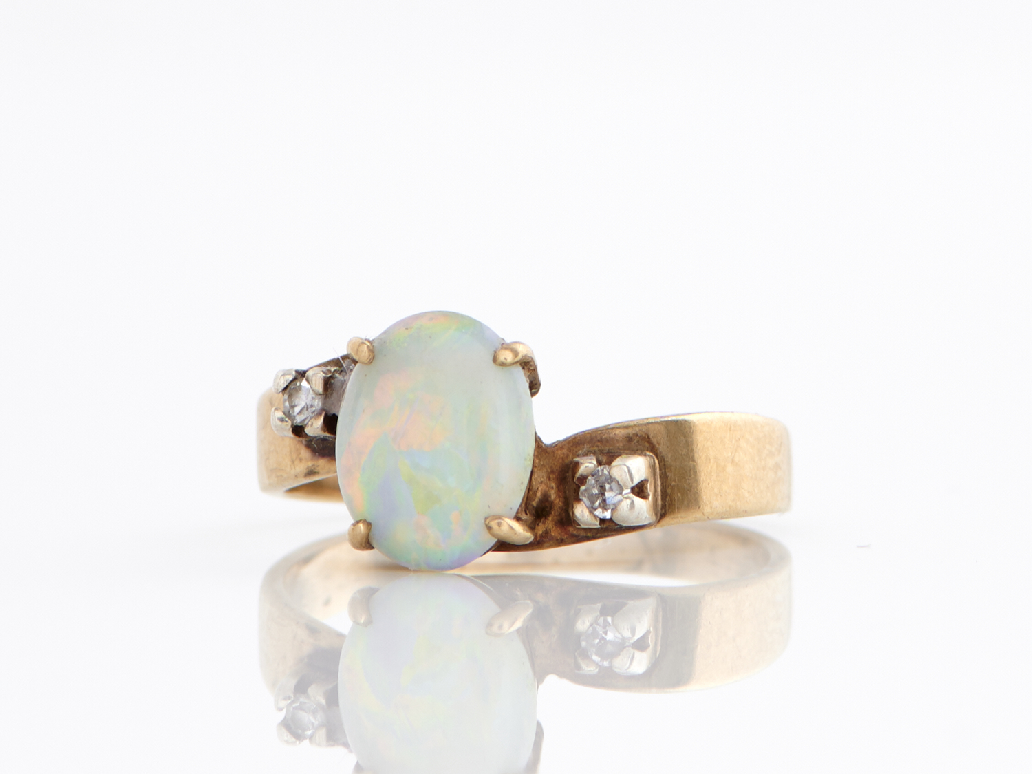 AN OPAL AND DIAMOND SET RING IN 9CT GOLD, RING SIZE N 1/2, 2.7GMS