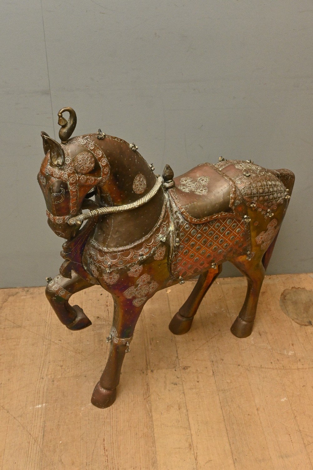 A DECORATIVE ANGLO-INDIAN PRESSED BRASS HORSE STATUE (95H X 93W X 25D CM) (LEONARD JOEL DELIVERY SIZE: X-LARGE)