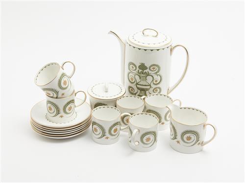 A SUSIE COOPER COFFEE SERVICE FOR SIX, ASSYRIAN MOTIF H.21CM (POT), LEONARD JOEL LOCAL DELIVERY: MEDIUM