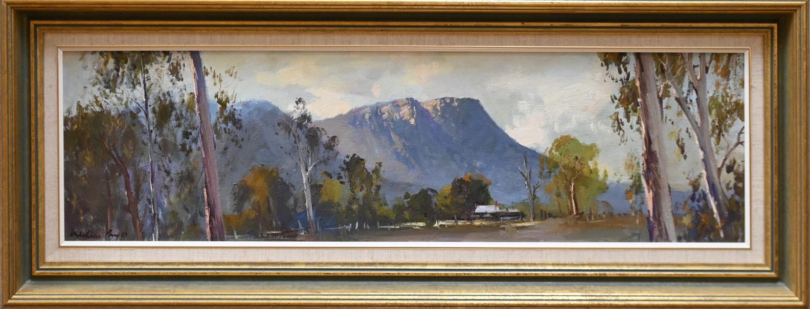 WYKEHAM PERRY, EARLY MORNING - MOUNT CATHEDRAL 2000, OIL ON CANVASBOARD, SIGNED LOWER RIGHT, 22 X 84CM, FRAME SIZE: 36 X 99CM