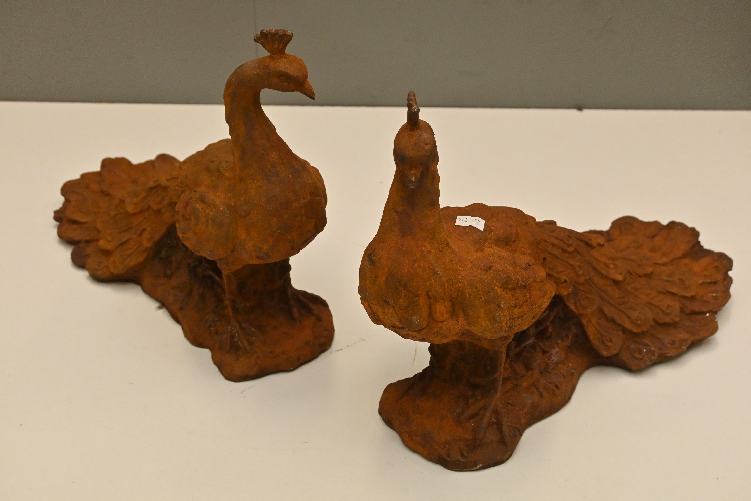 A PAIR OF CAST IRON PEACOCKS (31H X 22W X 40D CM) (LEONARD JOEL DELIVERY SIZE: LARGE)