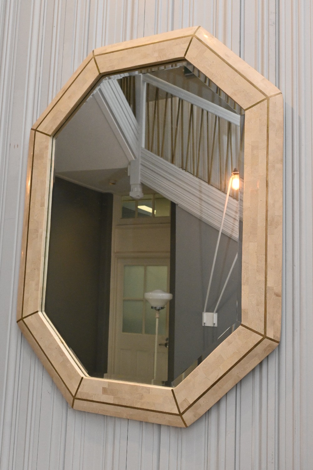AN ORNATELY DETAILED WALL MIRROR WITH TRAVETINE EFFECT (102H X 77W CM) (LEONARD JOEL DELIVERY SIZE: X-LARGE)