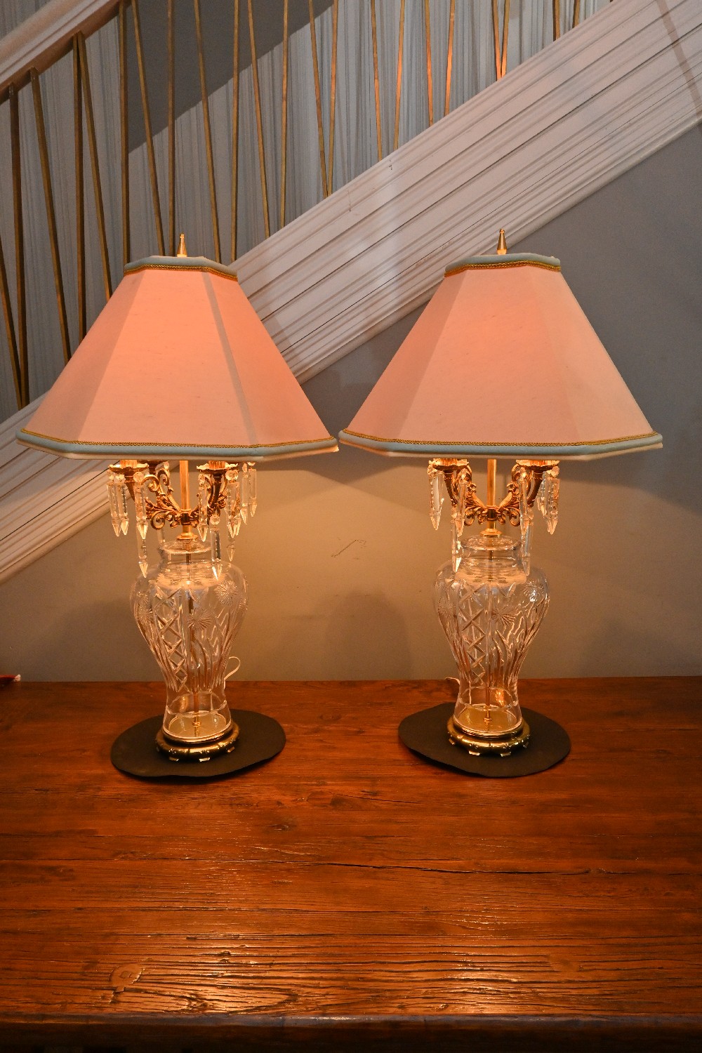 A PAIR OF LARGE CRYSTAL & GLASS TABLE LAMPS (A/F) (102H X 53W X 60D CM) (LEONARD JOEL DELIVERY SIZE: LARGE)