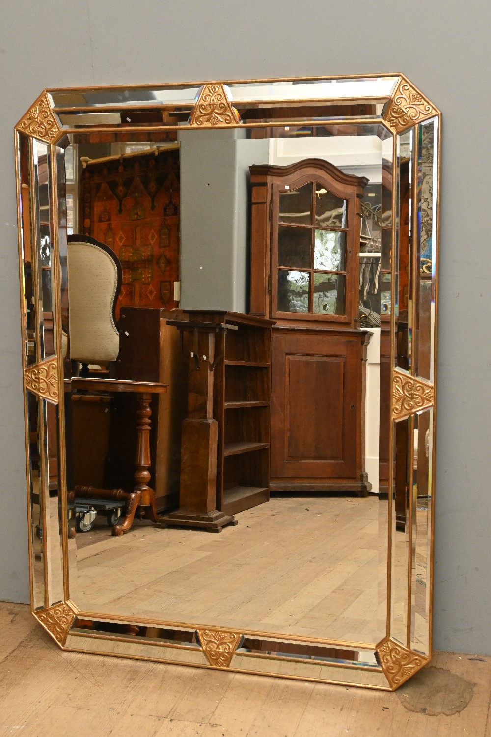 A SUBSTANTIAL RECTANGULAR BEVELLED EDGE WALL MIRROR WITH GILT EFFECT (150H X 110W CM) (PLEASE NOTE THIS HEAVY ITEM MUST BE REMOVED BY CARRIERS AT THE CUSTOMER'S EXPENSE. LEONARD JOEL STAFF CANNOT ASSIST CARRYING THIS ITEM) (X-LARGE ITEM)