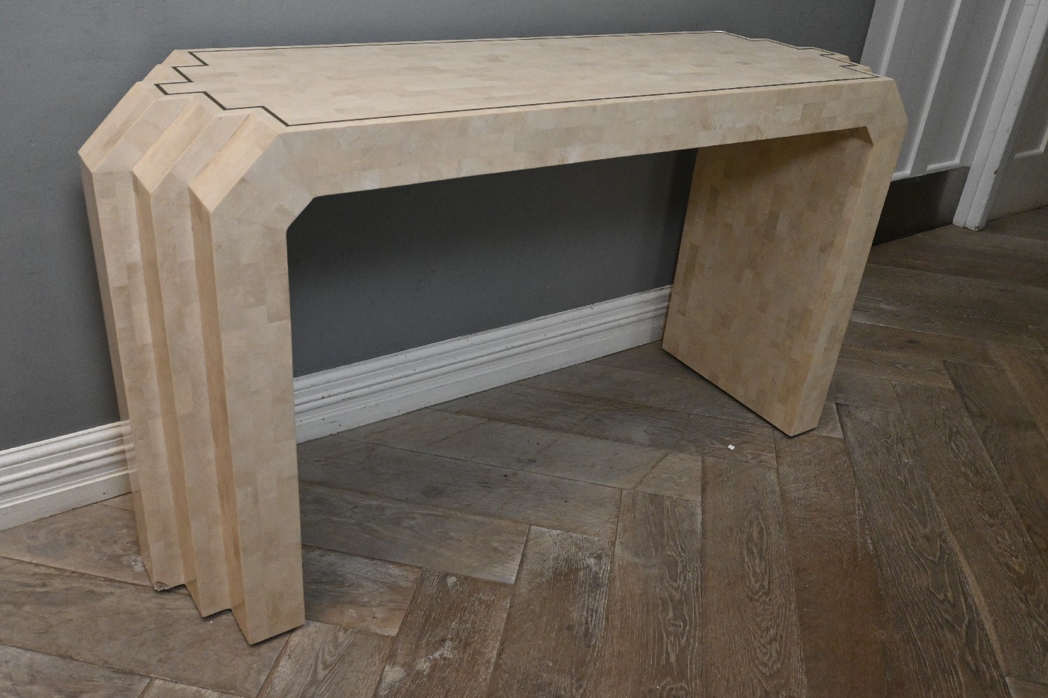 A TRAVETINE HALL CONSOLE WITH INDENTED ENDS (A/F) (75H X 140W X 42D CM) (PLEASE NOTE THIS HEAVY ITEM MUST BE REMOVED BY CARRIERS AT THE CUSTOMER'S EXPENSE. LEONARD JOEL STAFF CANNOT ASSIST CARRYING THIS ITEM) (X-LARGE ITEM)