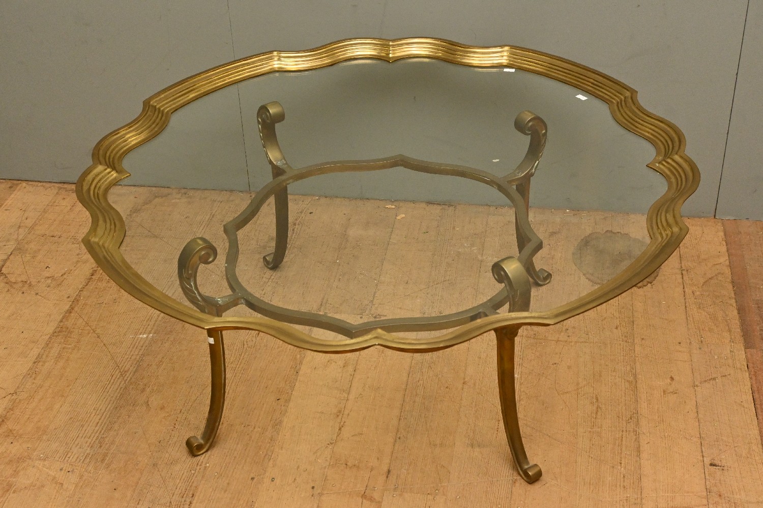 A BRASS & GLASS TOP COFFEE TABLE (44H X 107DIA CM) (LEONARD JOEL DELIVERY SIZE: X-LARGE)