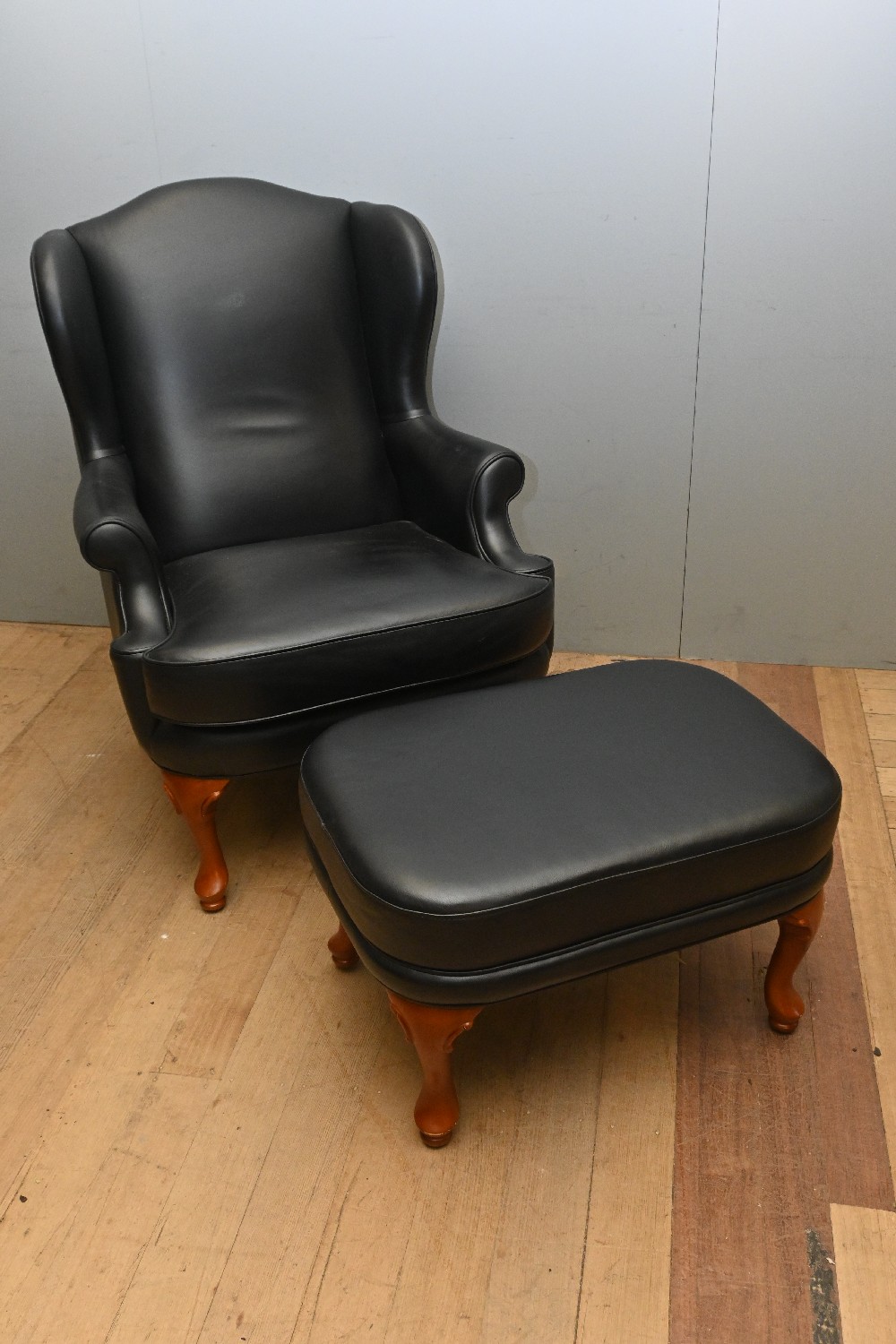 A LEATHER MORAN WINGBACK ARMCHAIR WITH MATCHED OTTOMAN (A/F) (104H X 78W X 70D CM) (PLEASE NOTE THIS HEAVY ITEM MUST BE REMOVED BY CARRIERS AT THE CUSTOMER'S EXPENSE. LEONARD JOEL STAFF CANNOT ASSIST CARRYING THIS ITEM) (X-LARGE ITEM)