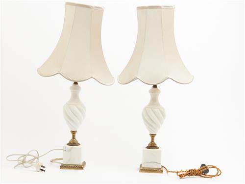 A PAIR OF VINTAGE 1950S BRASS AND MARBLE BASED TABLE LAMPS WITH BEIGE FABRIC SHADES H.68CM (TOTAL HEIGHT) LEONARD JOEL LOCAL DELIVERY: MEDIUM