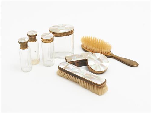 A SET OF EIGHT ANTIQUE MOTHER-OF-PEARL AND BRASS MOUNTED DRESSING TABLE JARS WITH BOX AND BRUSH 10.5CM (TALLEST), LEONARD JOEL LOCAL DELIVERY: SMALL